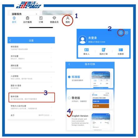 12306 एप डाउनलोड गर्नुहोस्, "Me(तलमा) → "सेटिङ्हरू" → "स्विच संस्करण" → अंग्रेजी संस्करणमा स्विच गर्न अंग्रेजी चयन गर्नुहोस्।