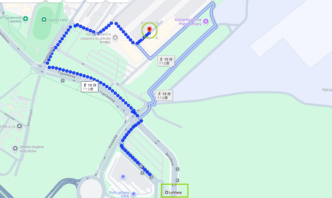 Letňany (मेट्रो C) + लगभग। 15 मिनेट पैदल