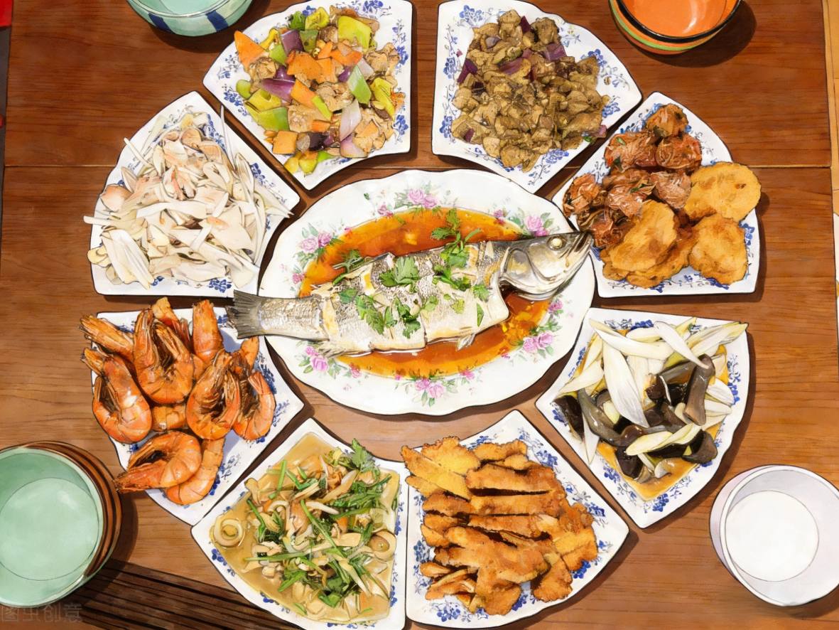 यद्यपि चीनको उत्तरी र दक्षिणी क्षेत्रहरूको आफ्नै पाक परम्पराहरू छन्, यो निश्चित छ कि खानालाई नयाँ वर्षको पूर्वसन्ध्याको रात्रिभोजमा विशेष अर्थ दिइन्छ। जसरी माछा भनेको वर्षैपिच्छे समृद्धिको चाहना हो, सलाद चिनियाँ भाषामा धनी हुने जस्तो देखिन्छ।