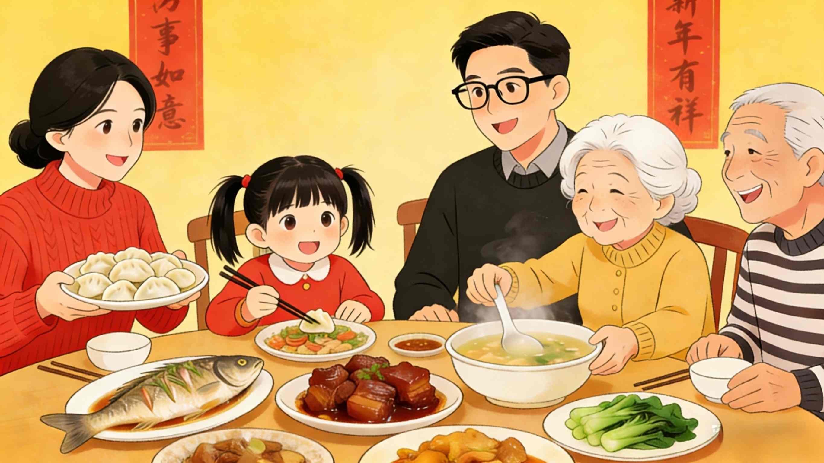 जनवरी ३० को साँझ, चिनियाँ क्यालेन्डरमा वर्षको अन्तिम दिन, परिवारहरू एक अर्काको संगतमा न्यानोपन र आनन्द साझा गर्दै, पुनर्मिलन रात्रिभोजको लागि भेला हुन्छन्।